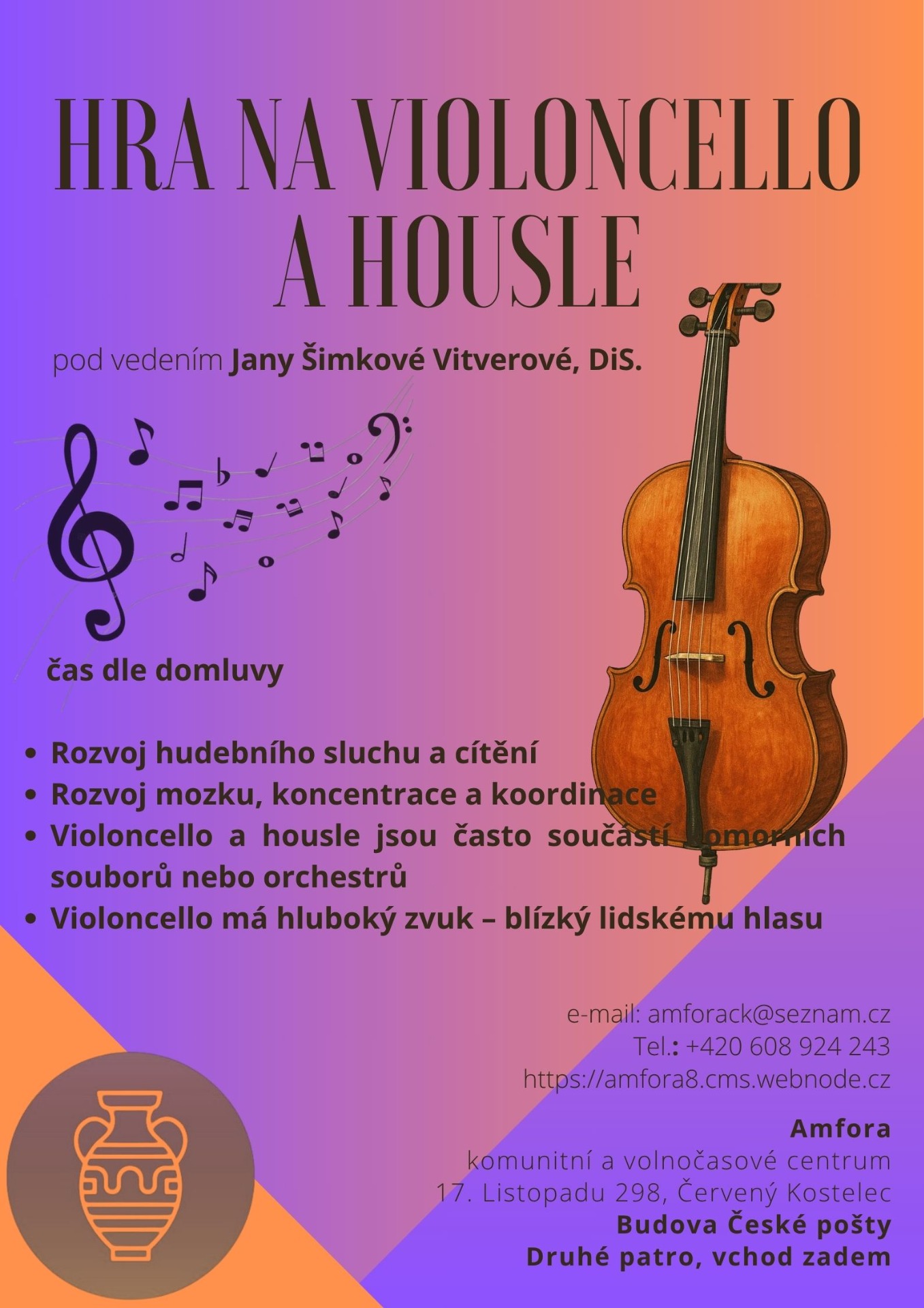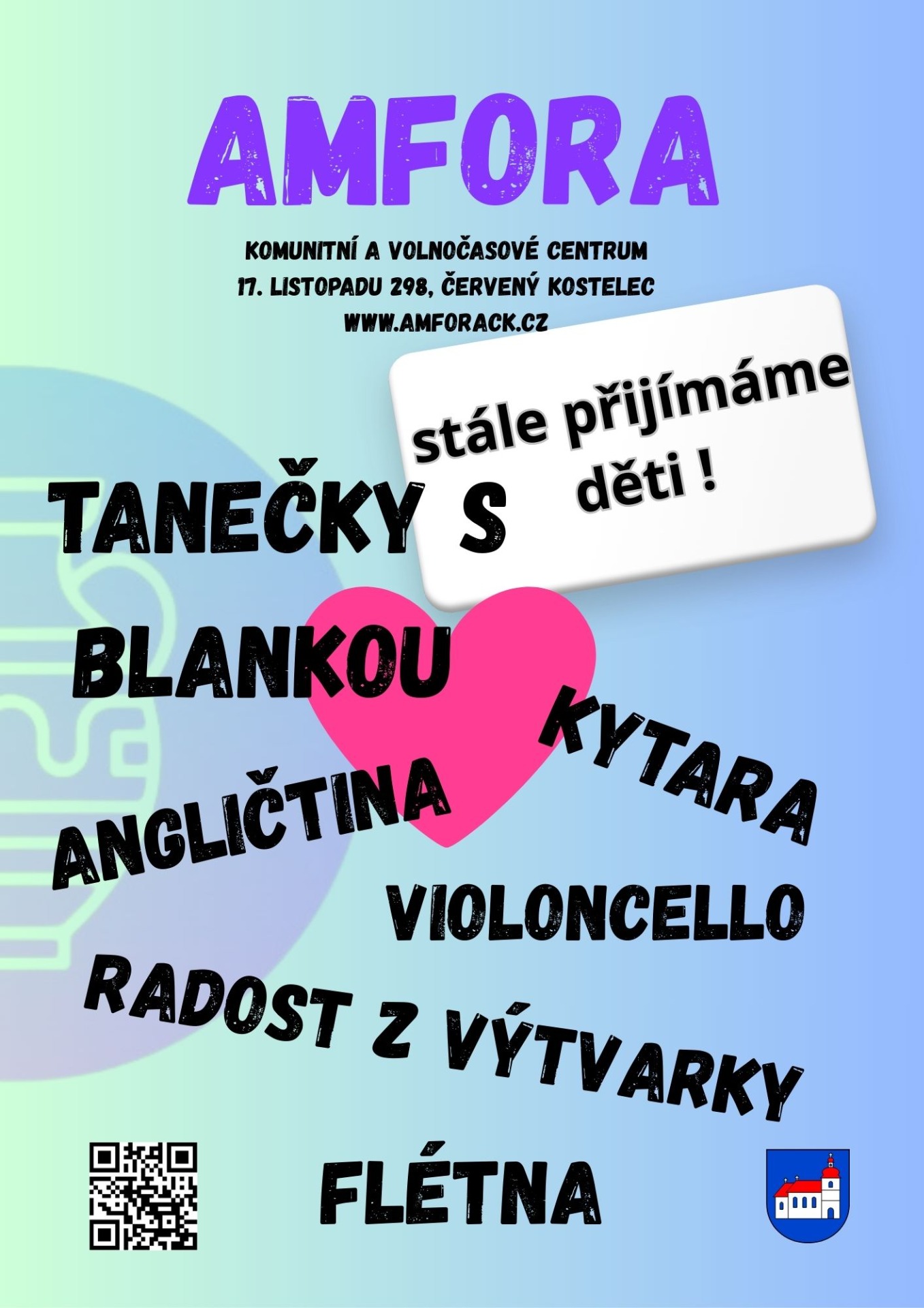 Vítejte v komunitním a volnočasovém centru AMFORA, kde pomáháme nejen dětem, ale i dospělým objevovat jejich talenty a rozvíjet se v radostném a inspirativním prostředí. Naše kroužky nejsou jen o hudbě, tanci a výtvarném umění – jsou o tom, jak pomáhat dětem růst, učit se a stát se sebevědomými, kreativními a všestrannými osobnostmi.