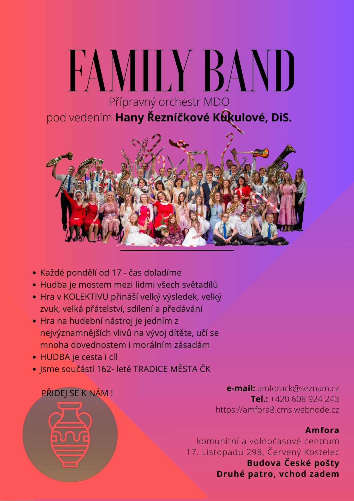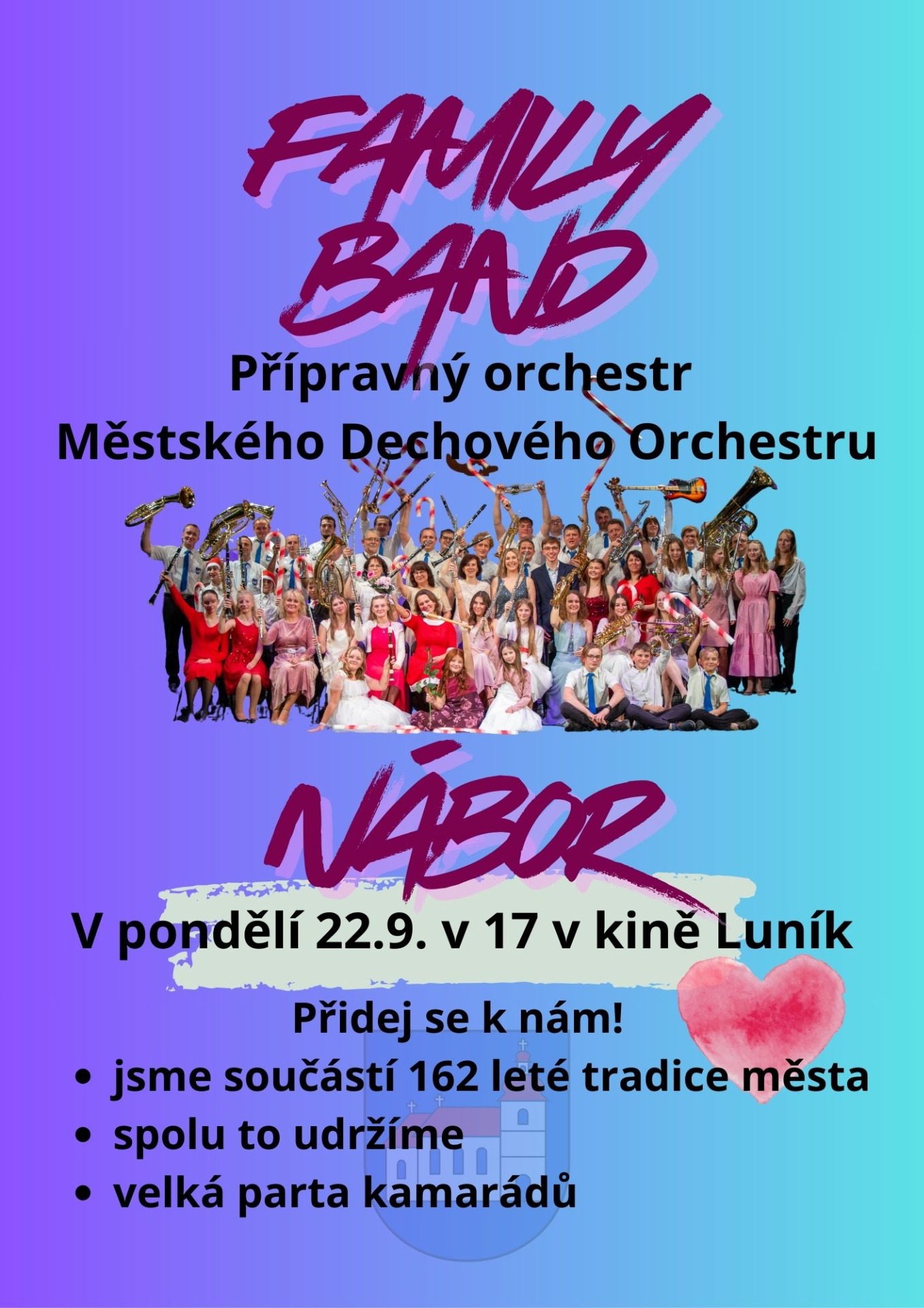 Family band- podporujeme tradici našeho nejstaršího spolku MDO( Městský dechový orchestr) nabízíme společné muzicírování nejen na akcích města, ale i výuku omezeného počtu zájemců o dechové nástroje patřící do orchestru (trubka, tenor, byryton, flétna, klarinet, saxofon...) naši muzikanti Vám rádi pomohou s nejkratší cestou do orchestru a ke společným zážitkům- předávání radosti našim posluchačům